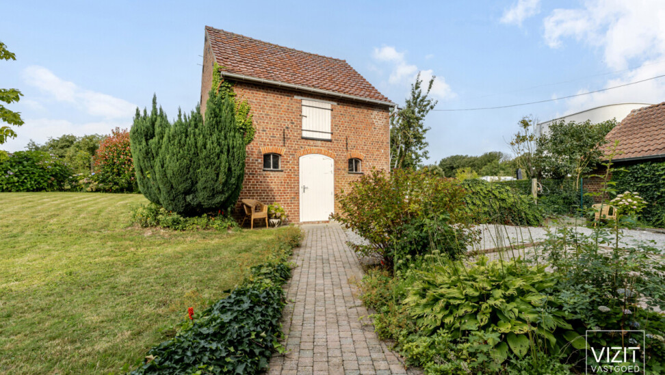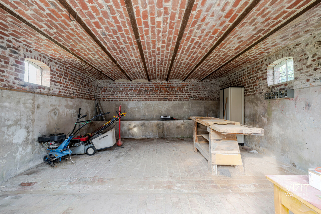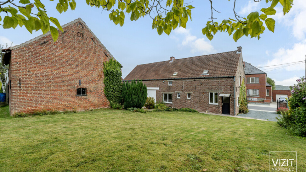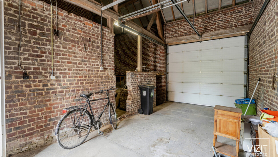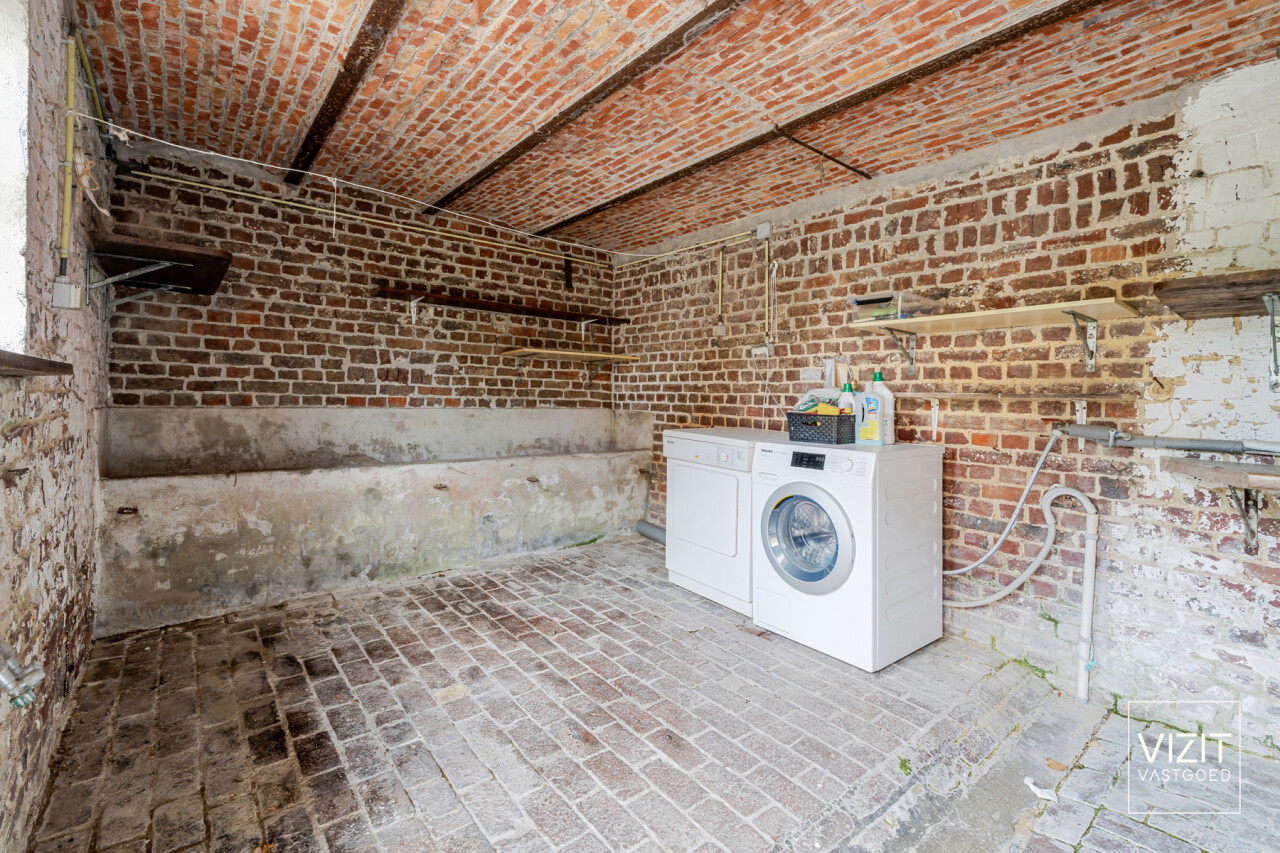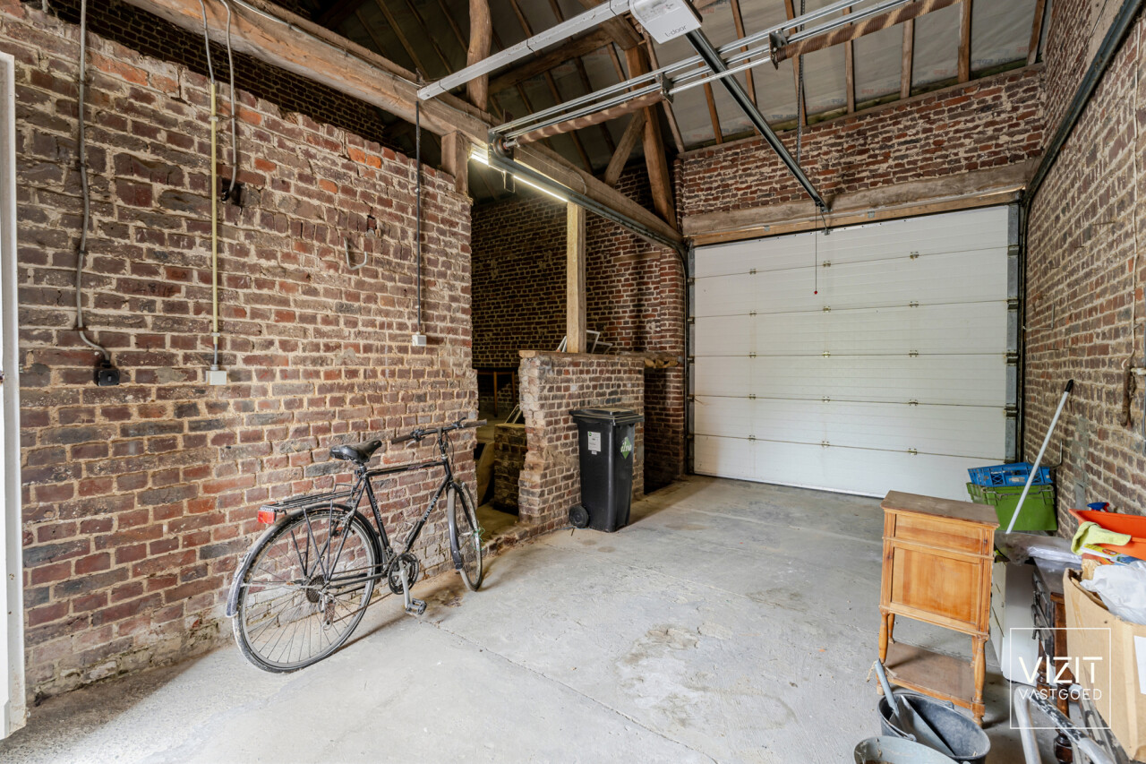 Op een perceel van 8a 2ca bevindt zich deze charmante, 19de-eeuwse boerderijwoning. Het gelijkvloers omvat een inkomhal, woonkamer en eetkamer, badkamer, keuken, ruime garage met automatische poort, wasplaats en een berging. Op de eerste verdieping vindt u een nachthal, drie slaapkamers, een berging en een bureau. Verder is er een kelder en een omheinde tuin met bijgebouw rond de gezellige binnenkoer.