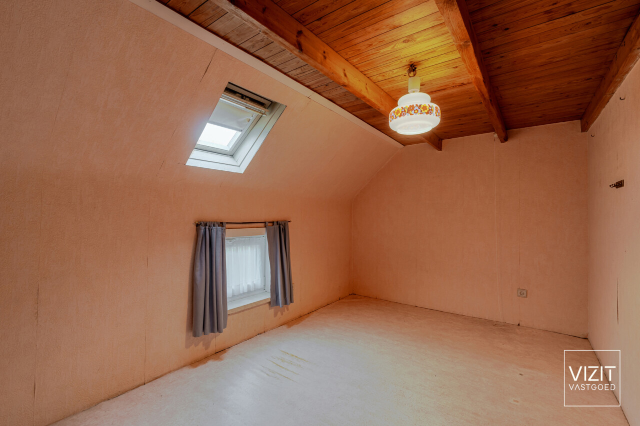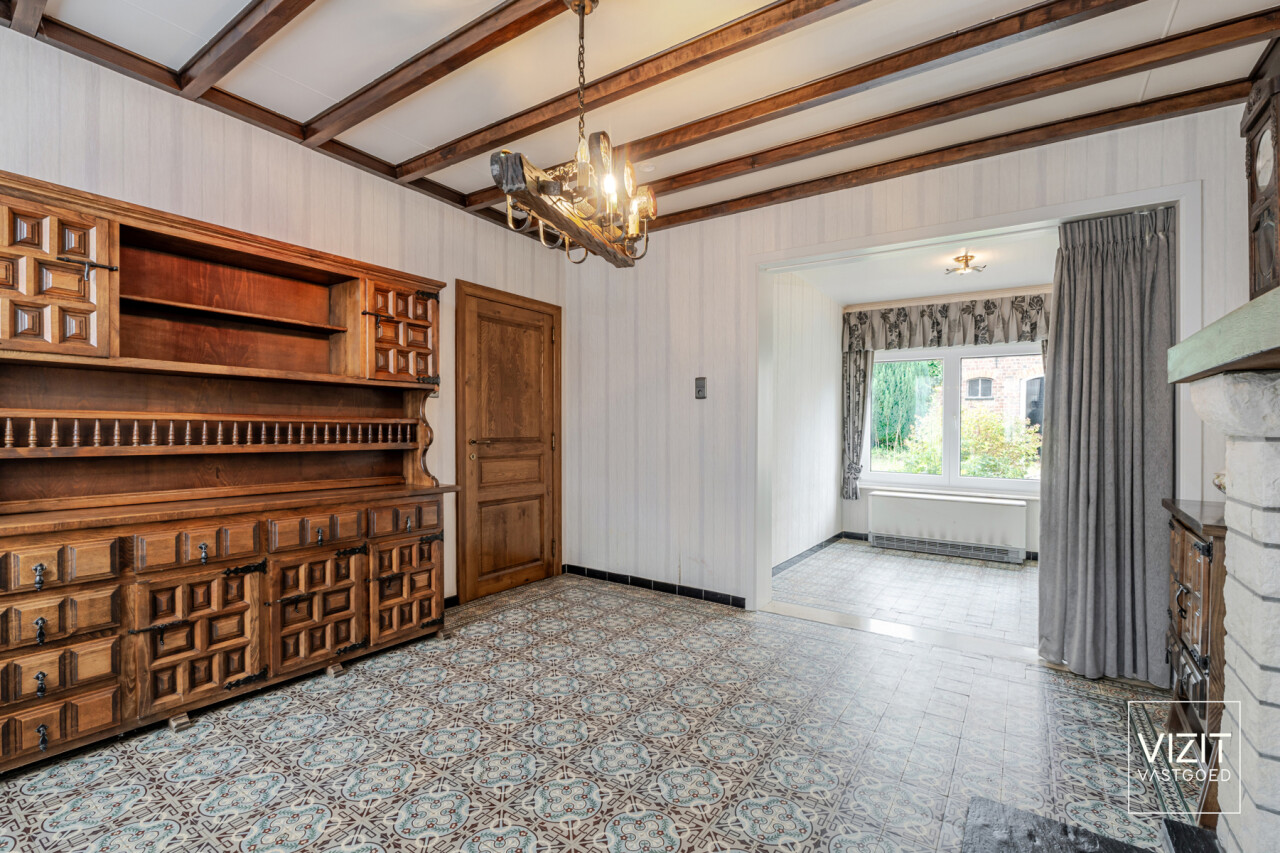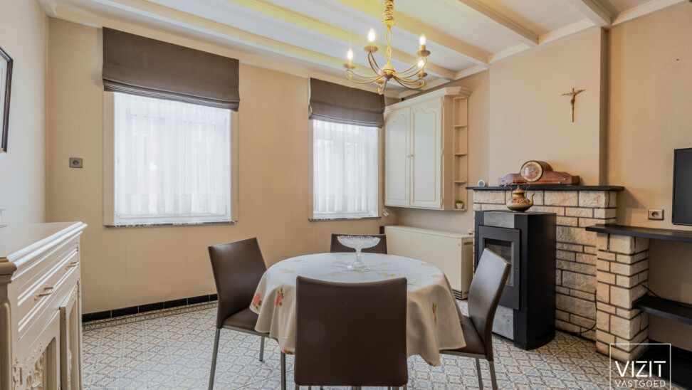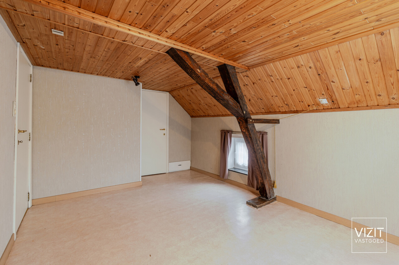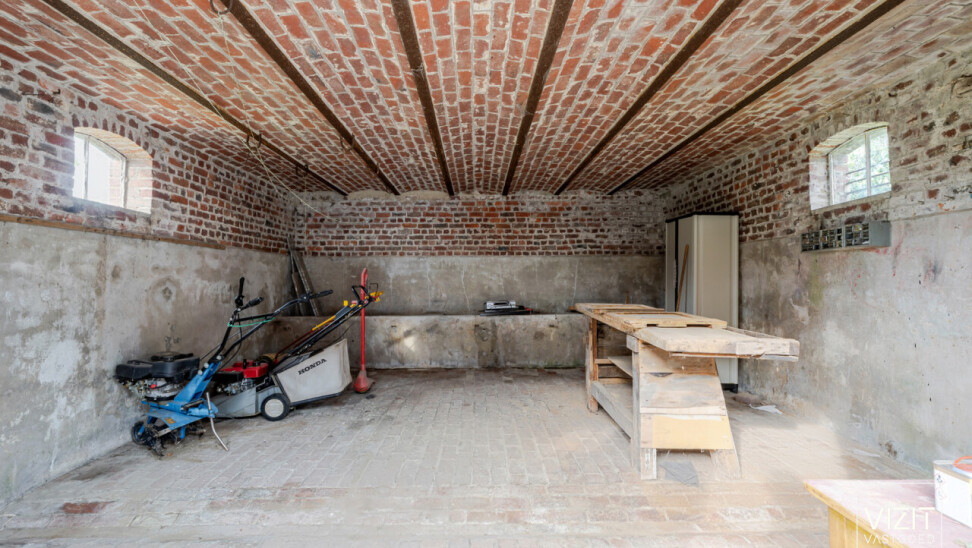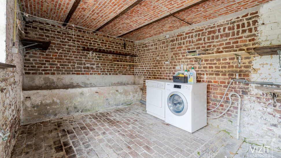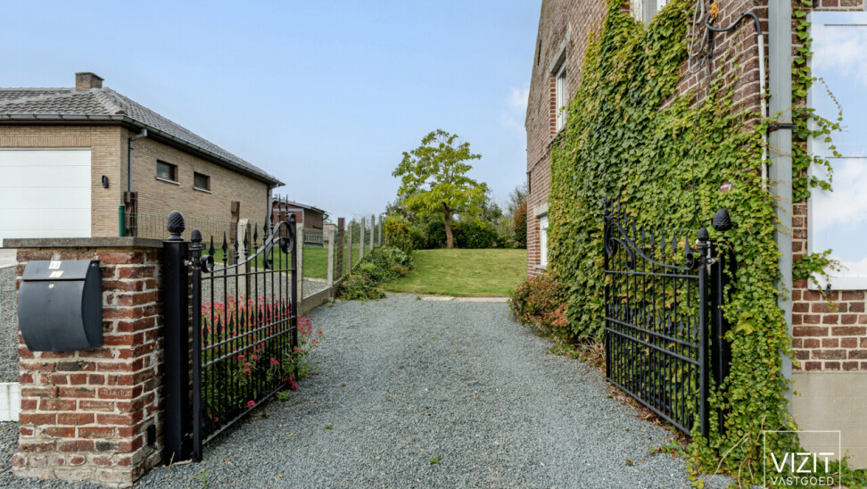 Op een perceel van 8a 2ca bevindt zich deze charmante, 19de-eeuwse boerderijwoning. Het gelijkvloers omvat een inkomhal, woonkamer en eetkamer, badkamer, keuken, ruime garage met automatische poort, wasplaats en een berging. Op de eerste verdieping vindt u een nachthal, drie slaapkamers, een berging en een bureau. Verder is er een kelder en een omheinde tuin met bijgebouw rond de gezellige binnenkoer.