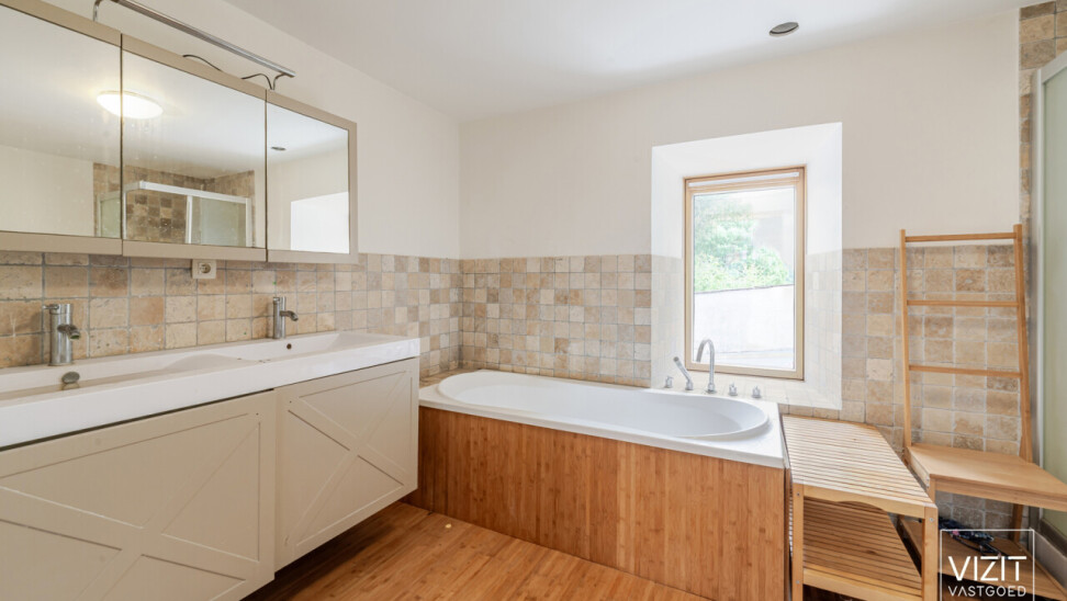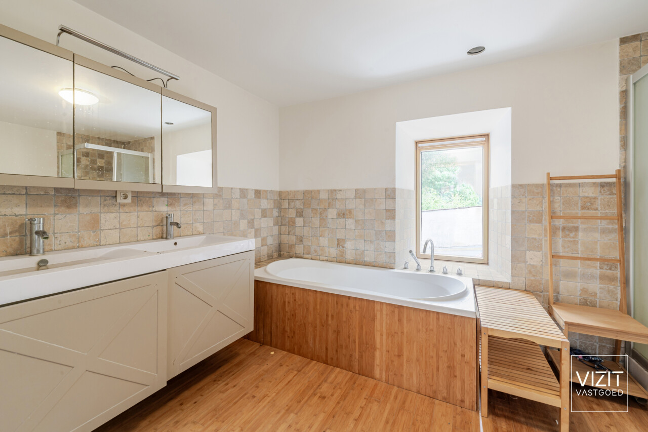 Het gelijkvloers omvat een zeer ruime inkomhal, een bijzonder ruime leefruimte, een keuken en een veranda met zicht op de tuin.