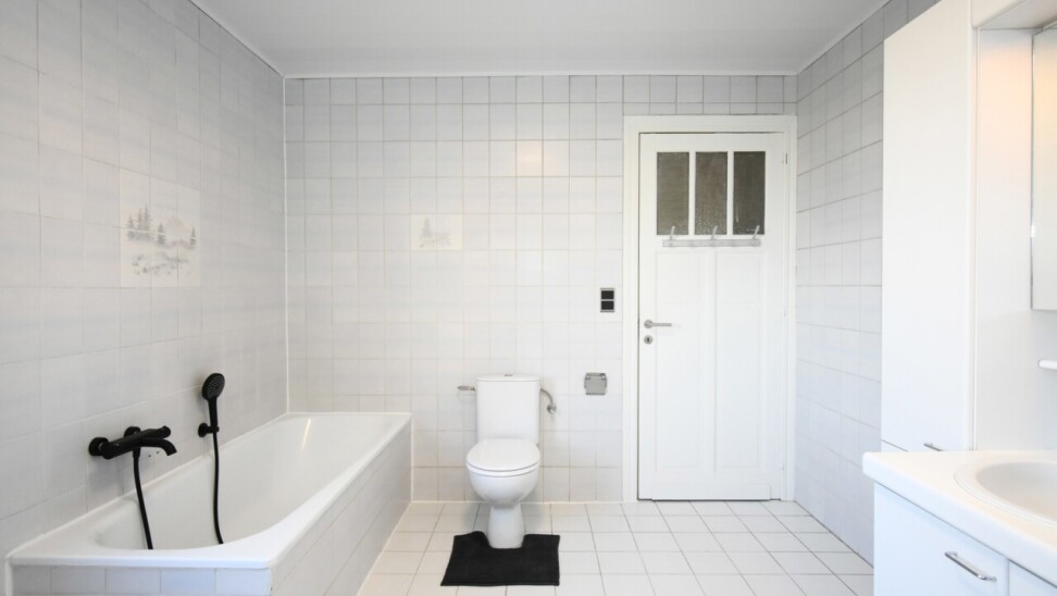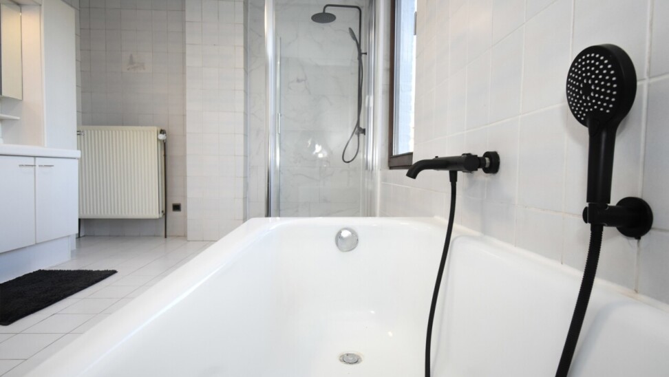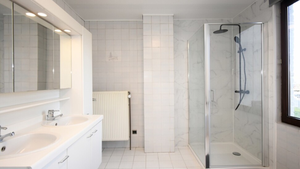 Op de eerste verdieping vinden we 2 slaapkamers en een badkamer met ligbad, douche en dubbele lavabo.